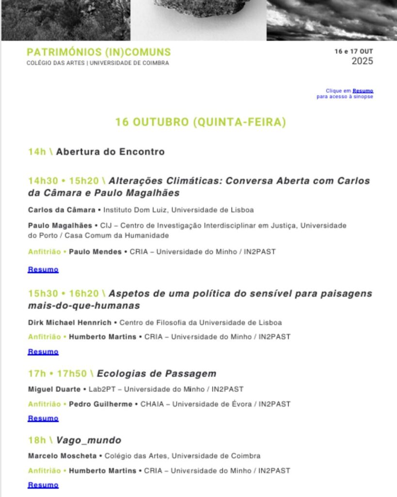 IN2PAST – Associated Laboratory for Research and Innovation in Heritage, Arts, Sustainability and Territory; CRIA – Network Center for Research in Anthropology; Lab2PT – Laboratory of Landscapes, Heritage and Territory; CHAIA – Center for the History of Art and Artistic Research Partnership: College of Arts, University of Coimbra Support: CAPC – Circle of Plastic Arts of Coimbra; Department of Life Sciences of the University of Coimbra; Doctoral Program in Anthropology of DCV – UC; Antropia – Anthropology Blog