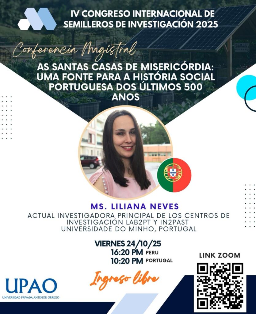 On October 24, 2025, researcher Liliana Neves will present a lecture as a guest researcher at IV Congreso Internacional de Semilleros de Investigación 2025 , at Antenor Orrego Private University, Peru, where she will address the topic “The Holy Houses of Mercy: a source for Portuguese Social History over the last 500 years.” The presentation will be held via Zoom and will begin at 10.20 pm (mainland Portugal time).