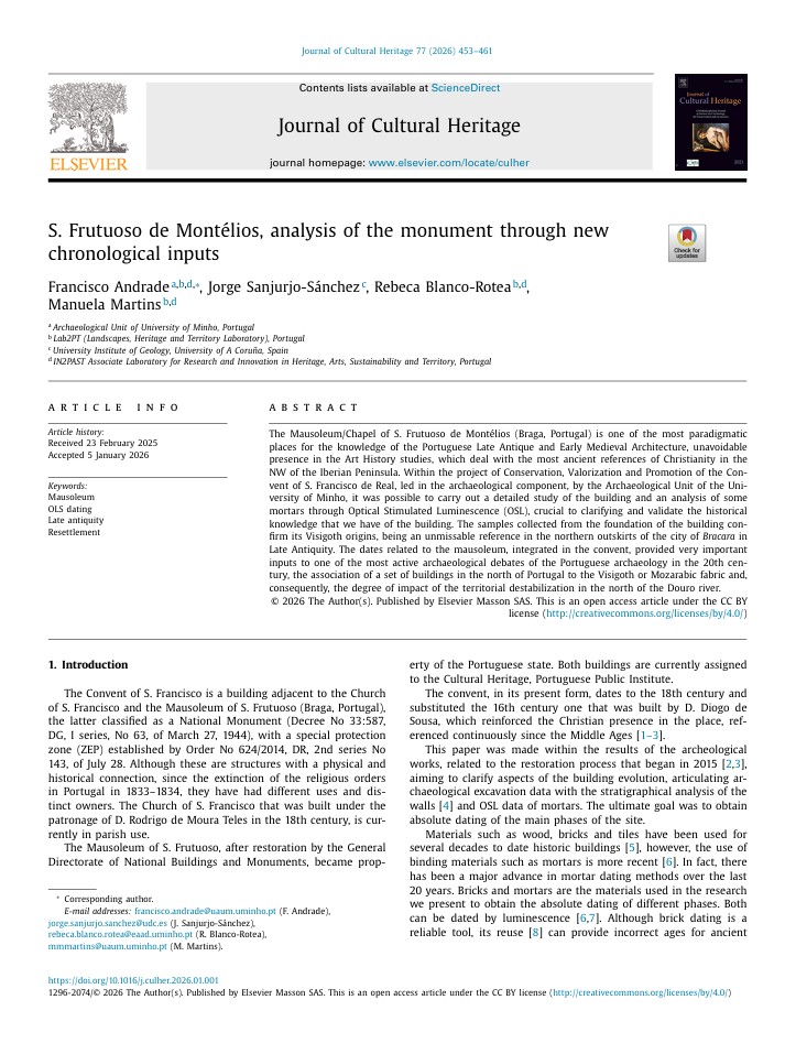 It was published in the Journal of Cultural Heritage and is available for download, the paper S. Frutuoso de Montélios, analysis of the monument through new chronological inputs, authored by Francisco Andrade, Jorge Sanjurjo Sánchez, Rebeca Blanco-Rotea, and Manuela Martins. The paper presents the main results of archaeological research within the project “Conservation, Valorization, and Promotion of the Convent of S. Francisco de Real.” The archaeological intervention was led by the Archaeology Unit of the University of Minho.
