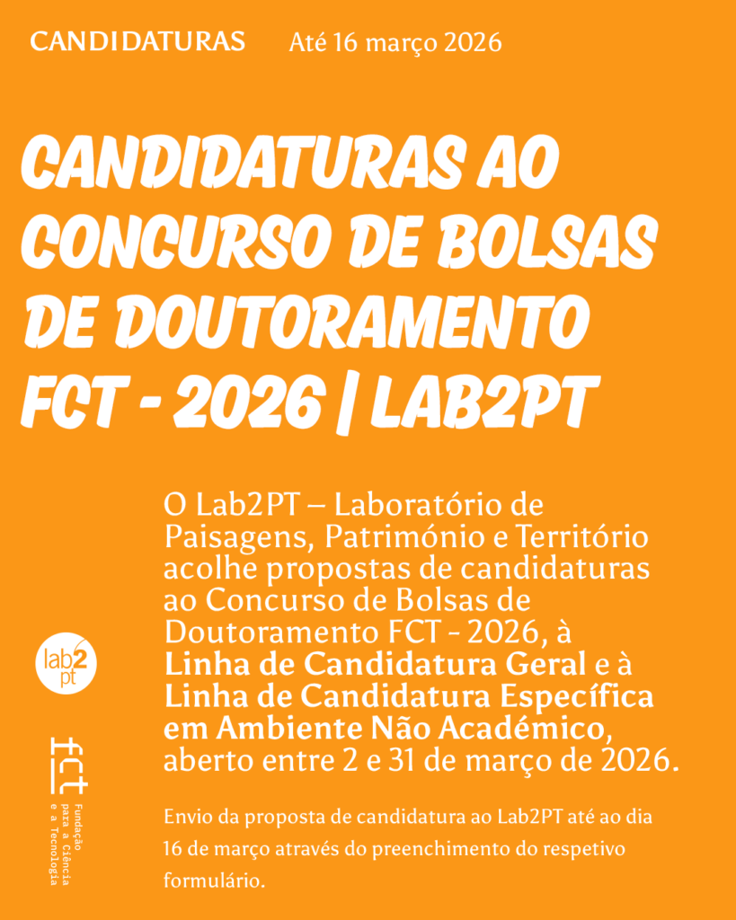O Lab2PT – Laboratório de Paisagens, Território e Património acolhe candidaturas como instituição de acolhimento ao Concurso de Bolsas de Doutoramento FCT – 2026, Linha de Candidatura Geral e Linha de Candidatura Específica em Ambiente Não Académico, aberto entre 2 e 31 de março de 2026.